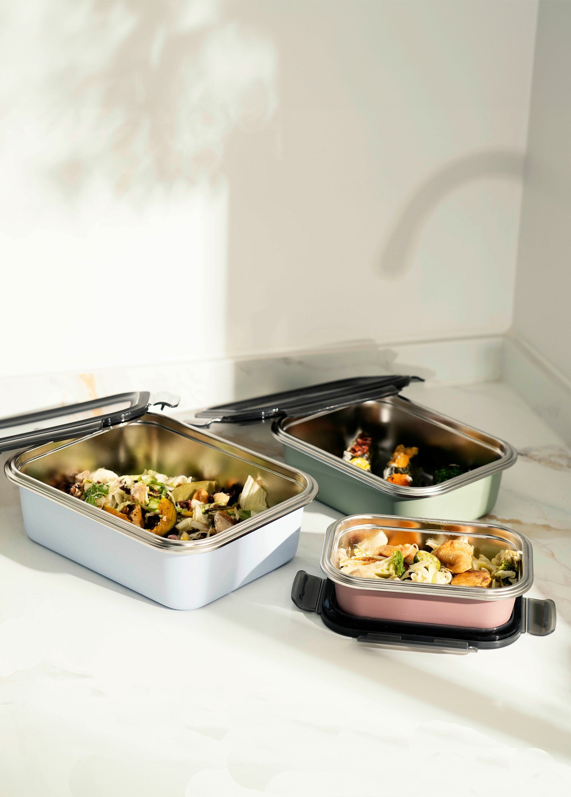 Stainless steel storage box and its PP lid: freezer safe, dishwasher safe. Clean this product before first use.